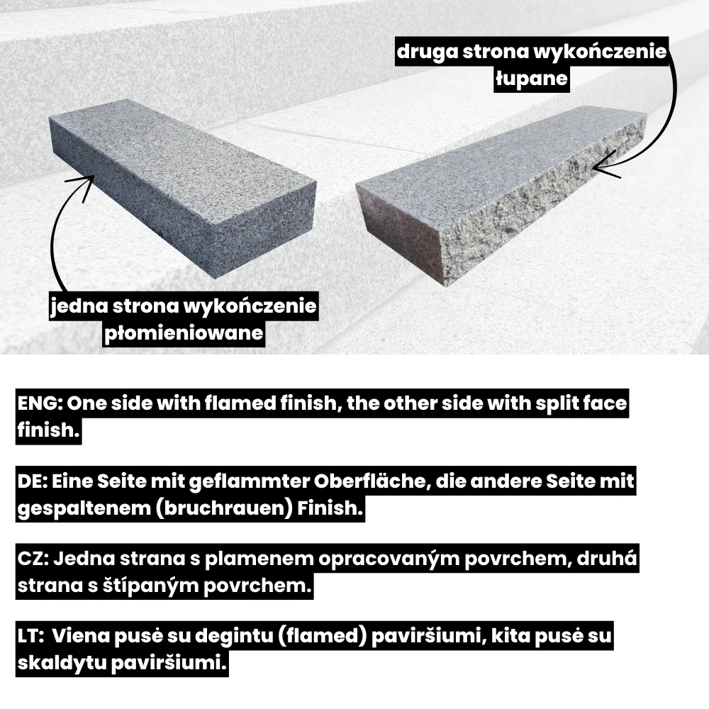 Jedna strona wykończenia jest płomieniowana, a druga strona łupana.