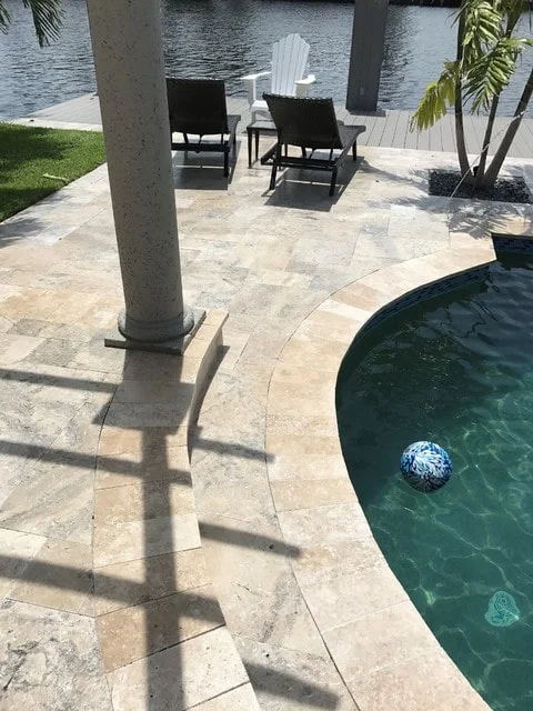 Obrzeża basenowe z trawertynu zapewniają komfort poruszania się oraz estetyczne wykończenie przestrzeni wokół basenu.