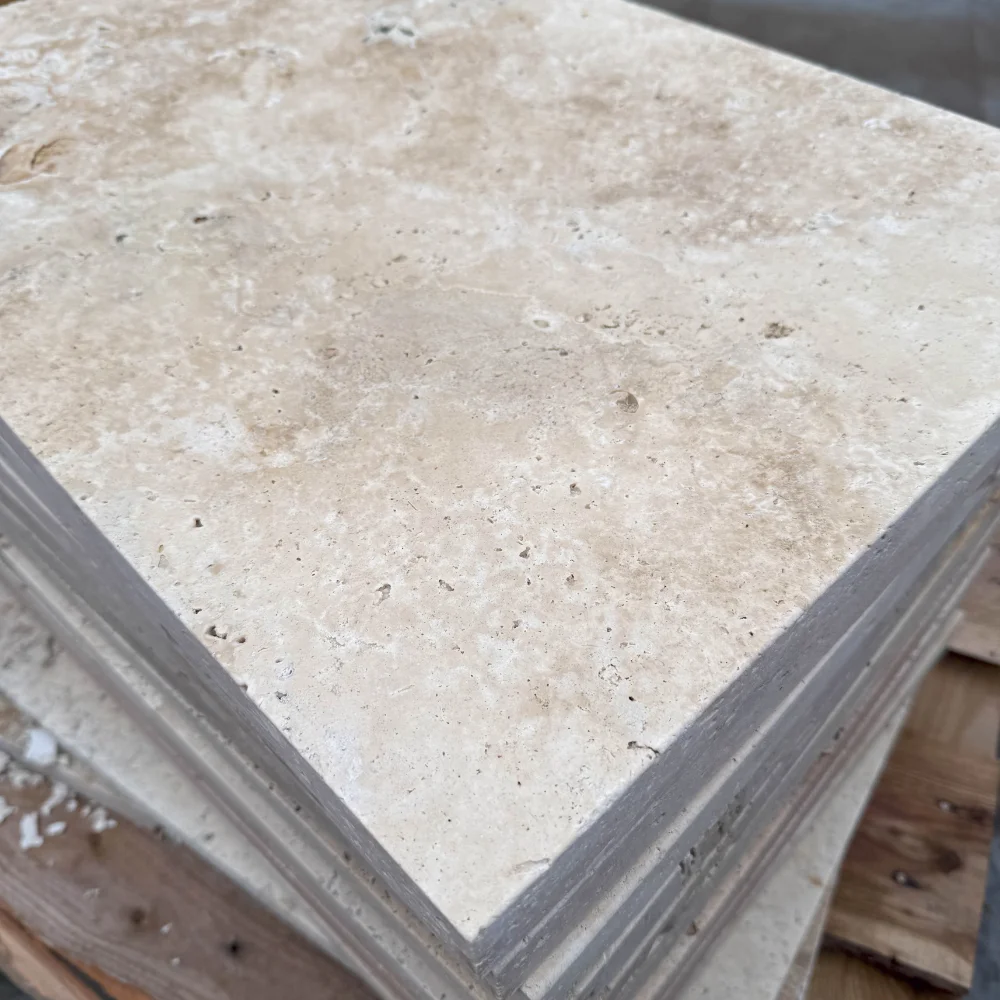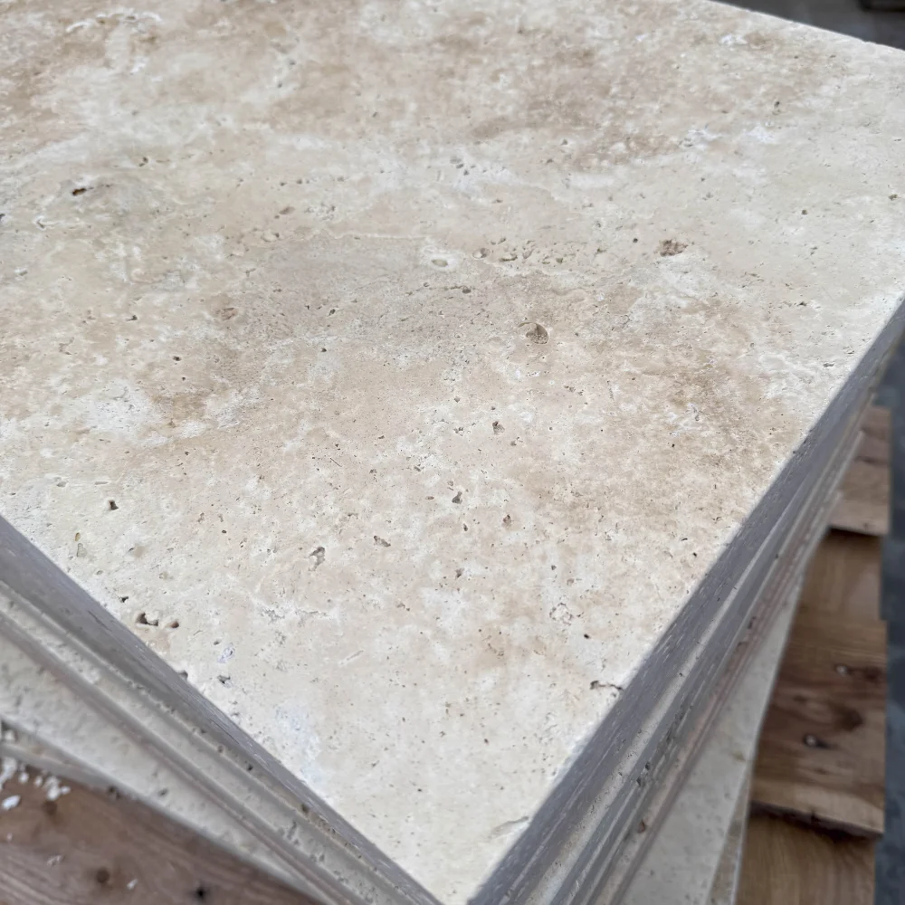 Powierzchnia trawertynu charakteryzuje się delikatną strukturą i naturalnymi porami, które nadają nawierzchni lekkości i elegancji. Grubość płytki zapewnia stabilność oraz trwałość w codziennym użytkowaniu.